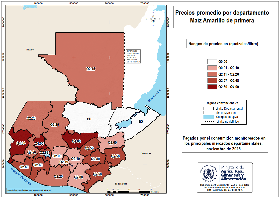 Mapa de precios departamentales de maíz amarillo - Noviembre 2025.png
